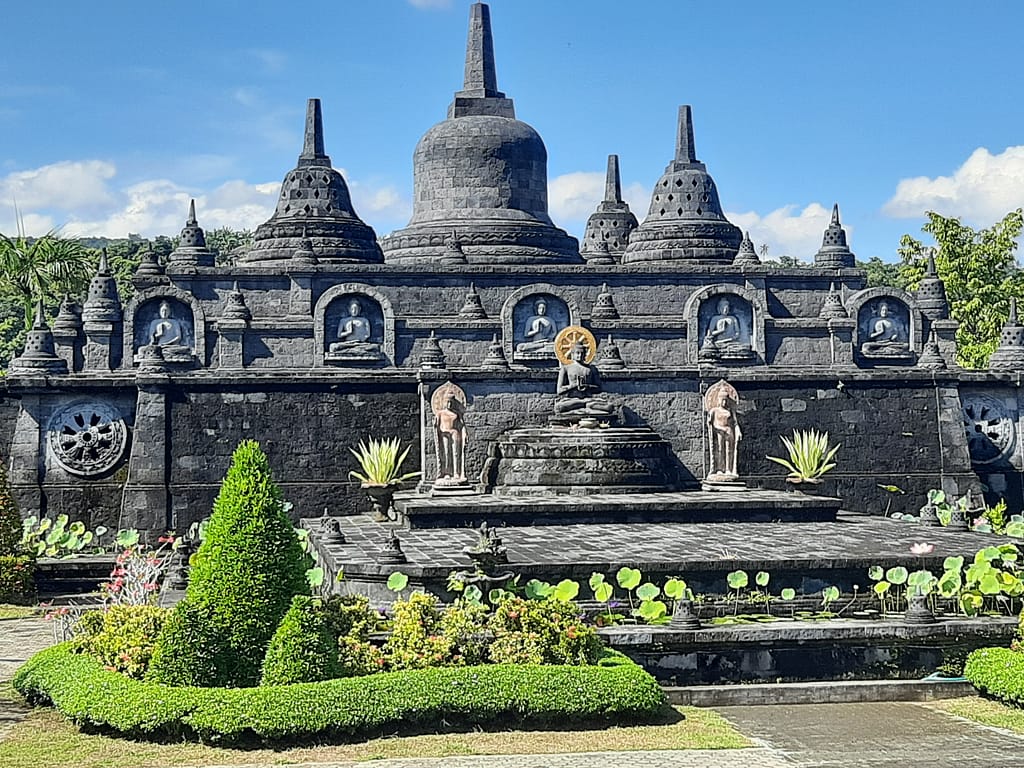 Brahma Vihara Arama Buddhist Monastery, also known as mini Borobudur is a temple complex built with the Borobudur temple of Yogyakarta as an inspiration. The structure is not of that scale, it is the small domes that resemble Borobudur ones