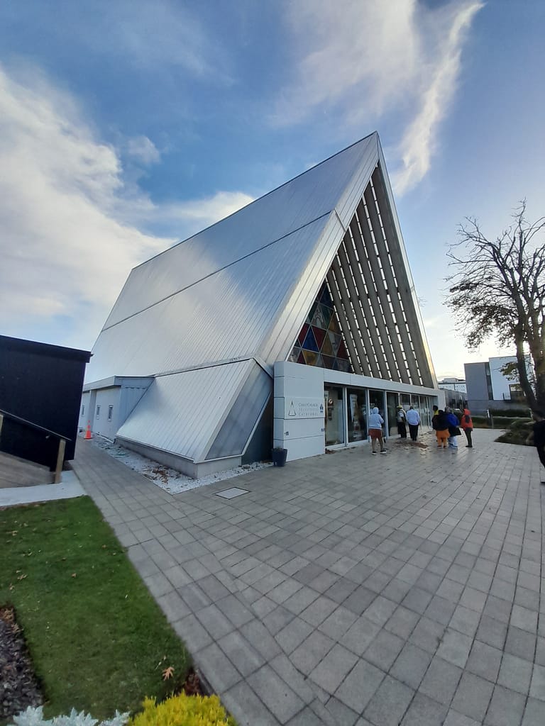 The cardboard cathedral is a memorial for people who died in Christchurch earthquake of 2011. It is colorful, built completely out of cardboard