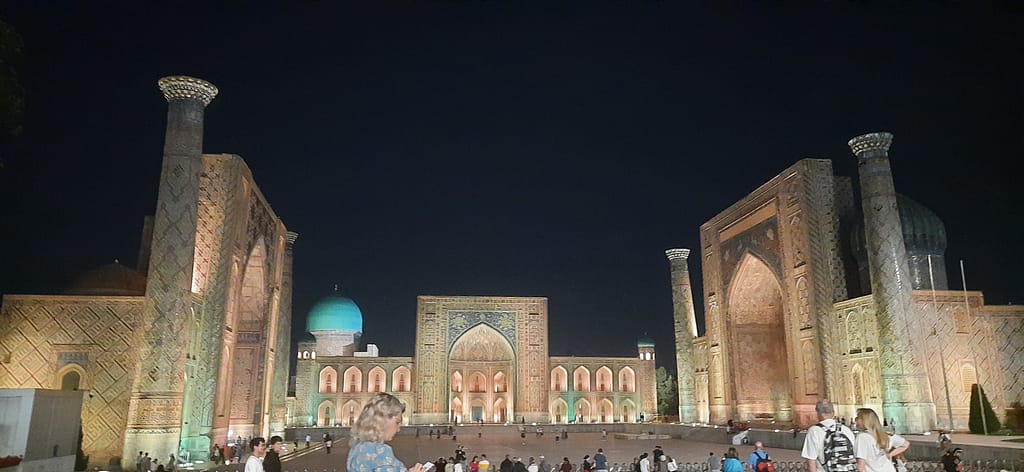 - Registan: Most popular monument of Uzbekistan with the famous courtyard and three large buildings on the sides. It has been restored after earthquakes to its present form. There is a tacky light show at night around 8 PM (could move across months) which we saw for first few minutes. It then got a bit repetitive, and we made a move